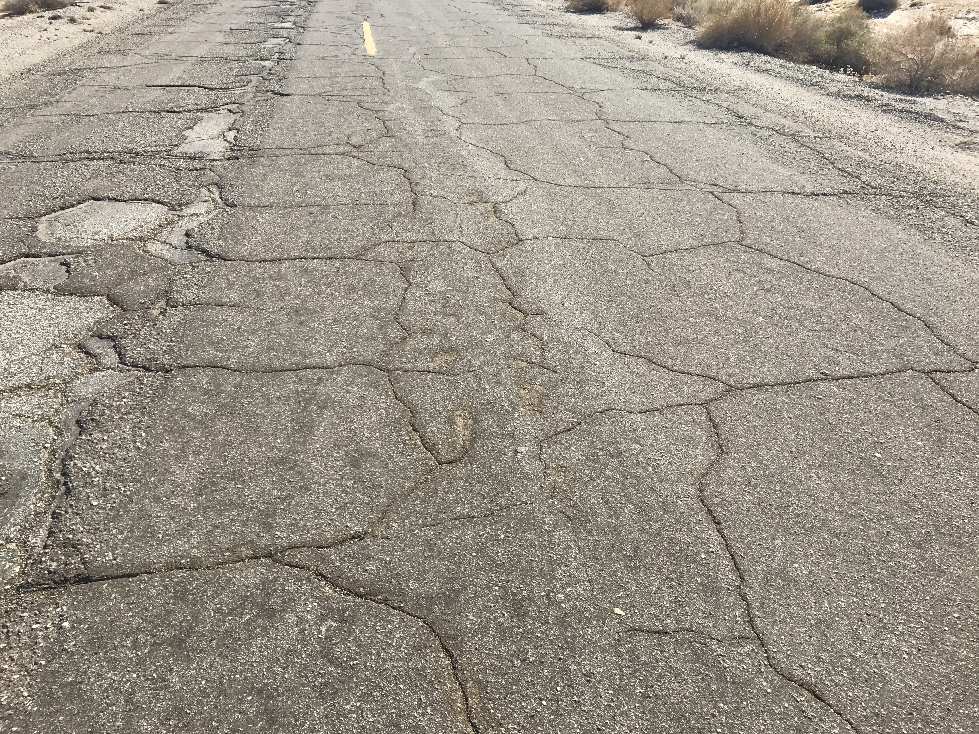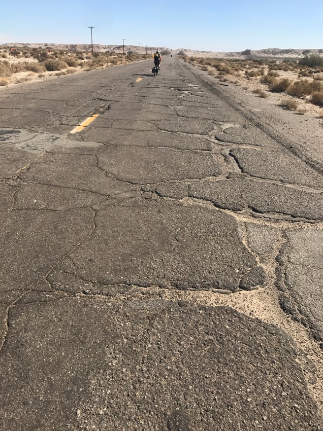 Once we survived that descent, we spent much of our time in the Imperial Valley on roads that paralleled I-8.  And I use the term “road” loosely, because they were more like patches of asphalt dropped in place randomly to form a broken up puzzle of cracks.  Big cracks. After 10 miles of cracked up road, my bike sounded like a rattle trap, and my wrists were completely numb, but I could hardly complain, because now we had acquired a tail wind that was pushing us down the road at 20+ miles per hour.