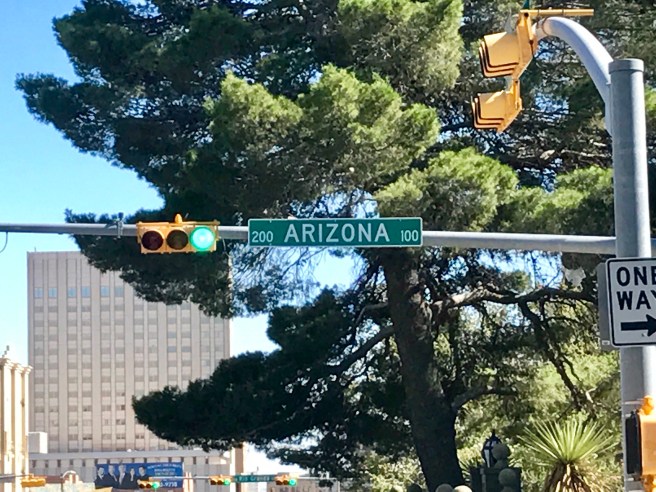 I passed through the UTEP campus, stopped at Crazy Cat Bikes to look for a new skull cap, passed the really cool street sign below, and rode through a really nice downtown area. I mean, it was really nice–with an arts district and cool public art installations that I didn’t have time to stop and look at. And I wondered how I spent 13 months in El Paso and no one ever took me downtown to see any of the sights there.