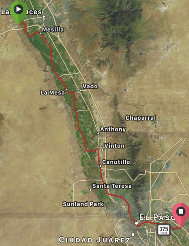 The land around the Rio Grande is fertile farmland, and I passed more cotton, peppers and pecan groves throughout the day. Ed and I bumped into a local fellow who was out cycling, a couple of days ago, and he circled back to talk to us while we rode along. When we commented on how nice the gentle downhill was, he told us that the Rio Grande drops 5 feet per mile, which explained it. Our route has been following the Rio Grande for 4 days. Tomorrow will be the last day of that treat. View of the mountains across the border