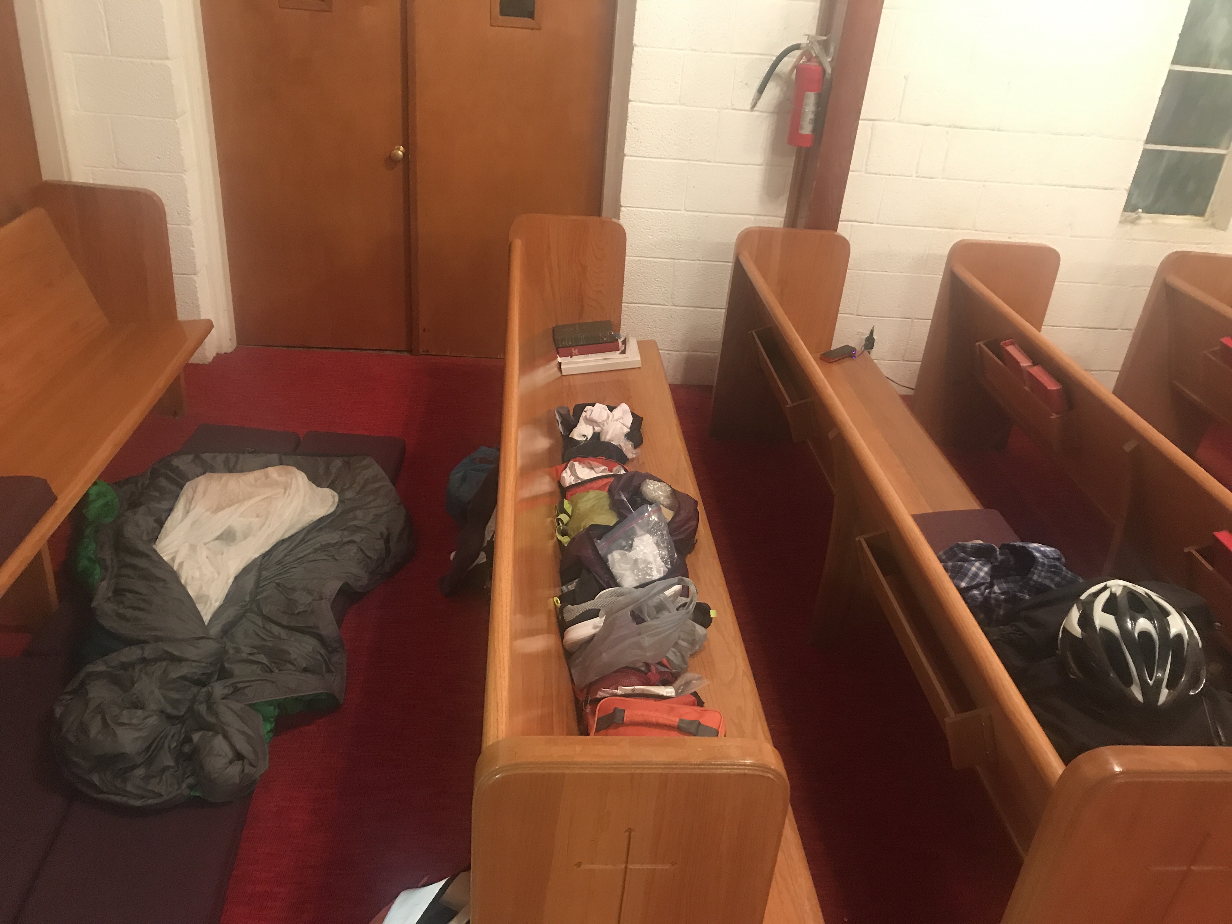 We were bedded down all the over the place: in front and behind the pulpit and communion table; and on and under the pews. And I must say, we all slept very well.