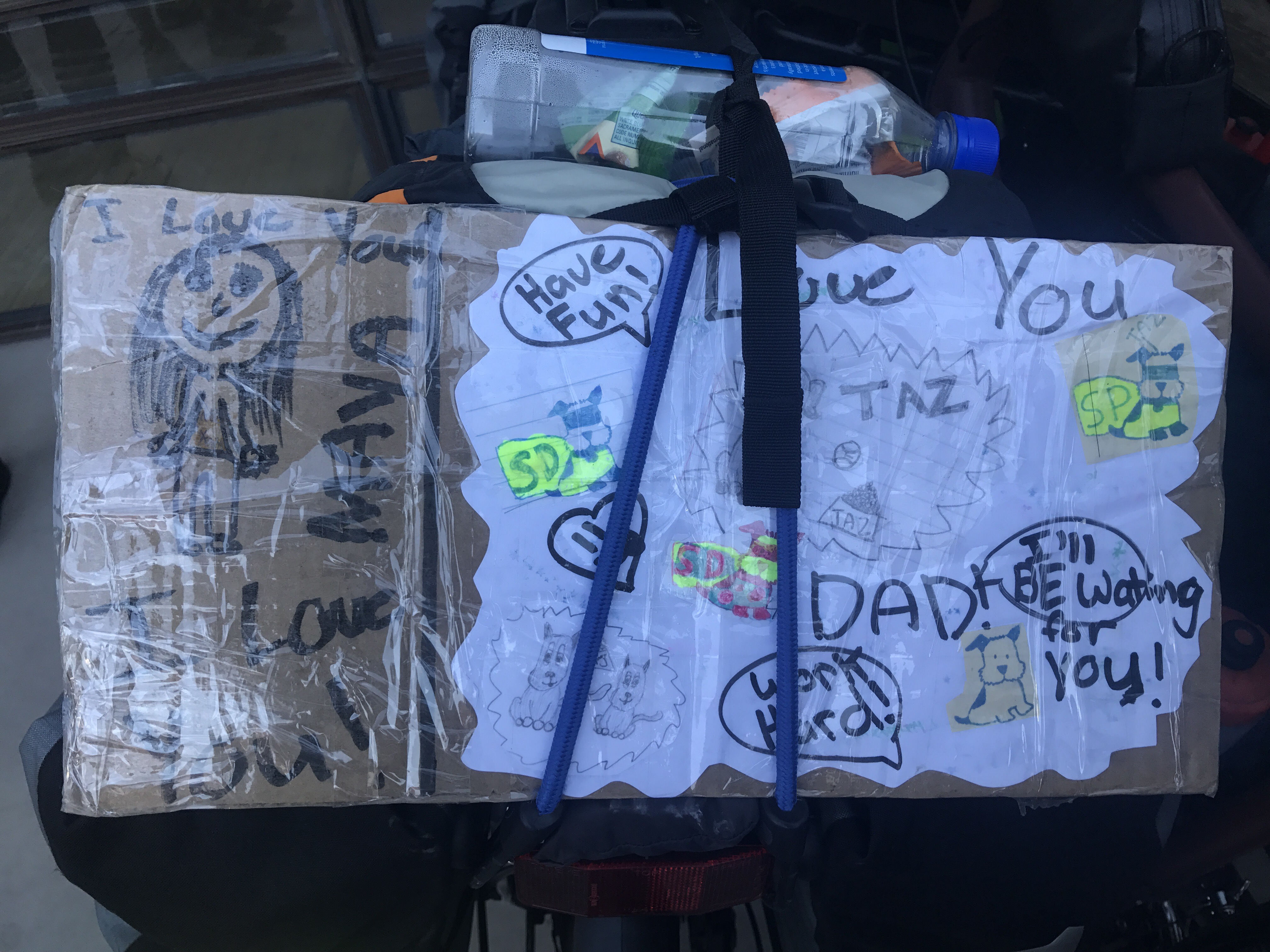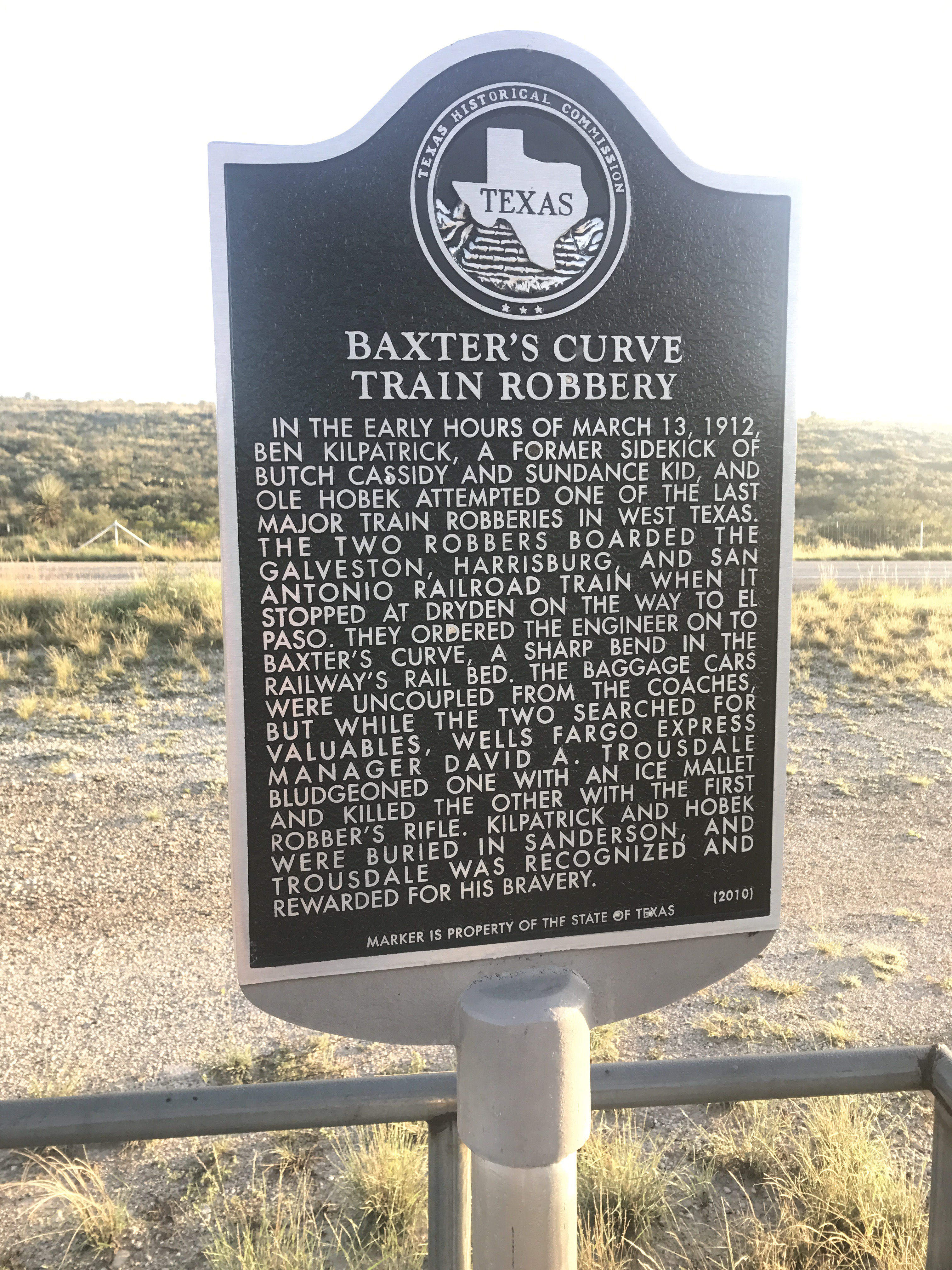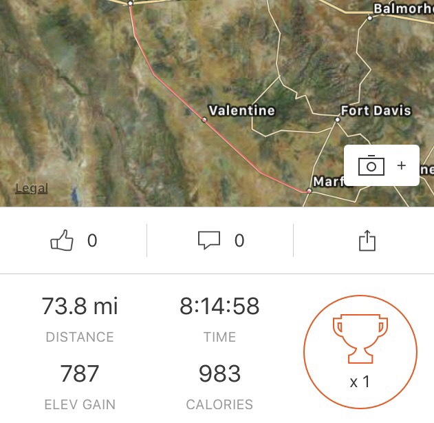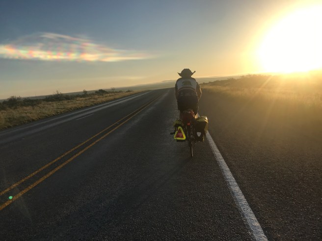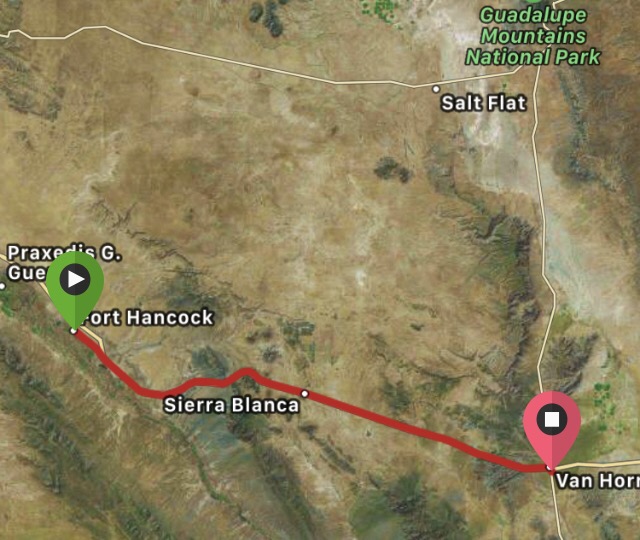 The day had 2 highlights. The first was crossing over into the Central time zone and resetting all our electronic devices. I mean, come on. This is progress, right? The second was an almost 8 mile descent into Van Horn. The headwind took a little bite out of it, but it was still downhill, and my legs were pretty much wasted, by then, so it felt like a gift.