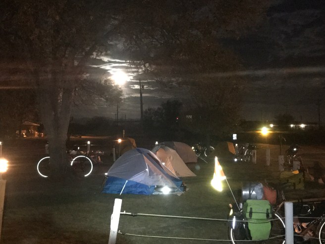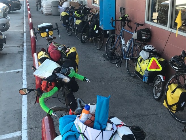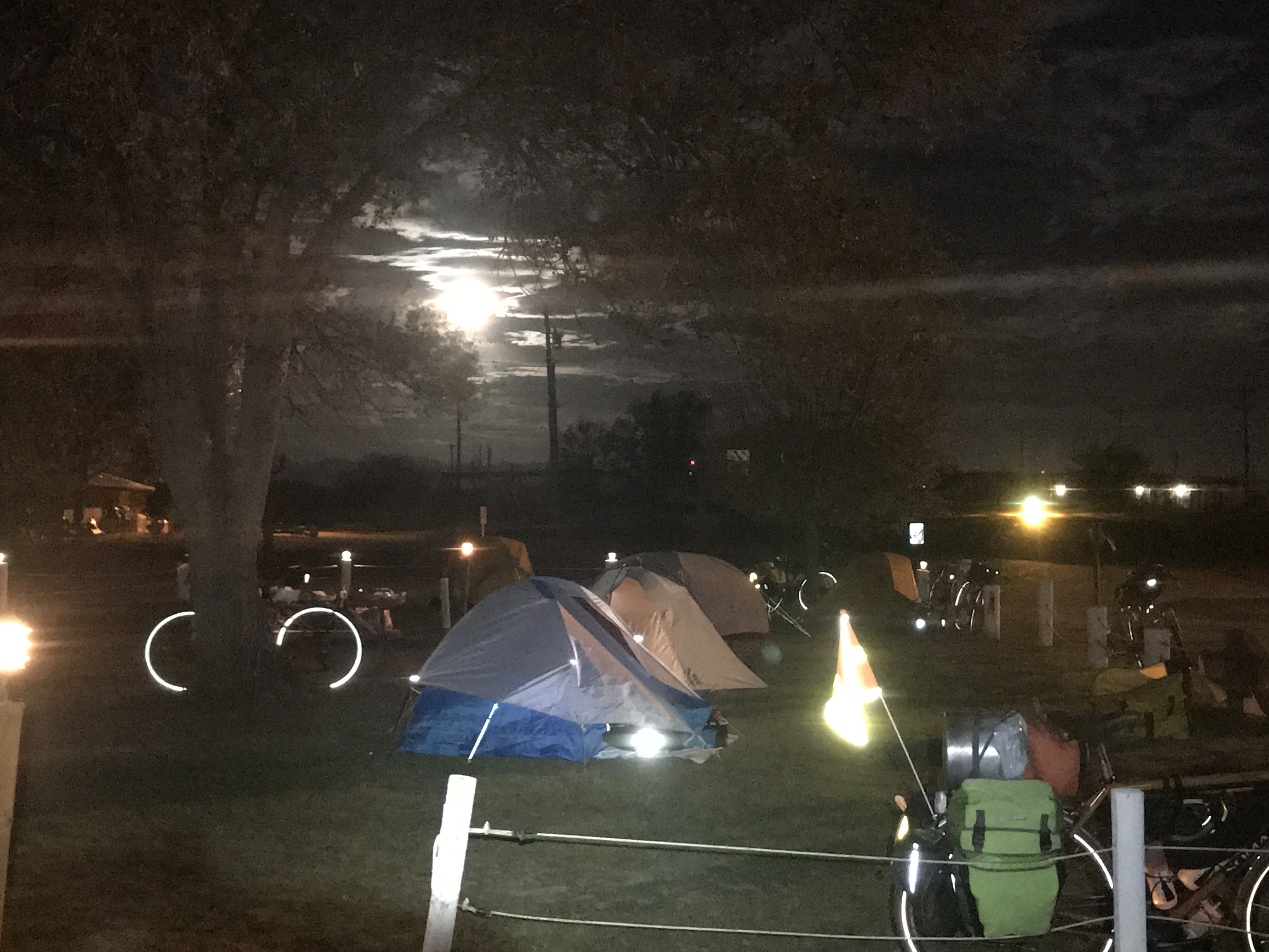 The wind died down just as we started a descent that lasted through arrival in Marsthon, where we were spending the night. We were so happy to get to the RV park early, but our joy didn’t last long. There were stickers everywhere in our large group campsite. I found some cardboard to put under my tent to keep them from puncturing my Therm-a-rest, and all of us had to park our bikes away from the campsite to avoid flat tires.