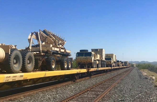 It of reminded me of when I arrived at Fort Hood during Desert Storm. During my first few weeks there, one or more trains arrived on the railhead that passes thru Fort Hood and were loaded up with CONEX boxes, vehicles, and armored aircraft and vehicle to be moved out to a port for shipment to Iraq. Hopefully today’s load is not headed to Korea.