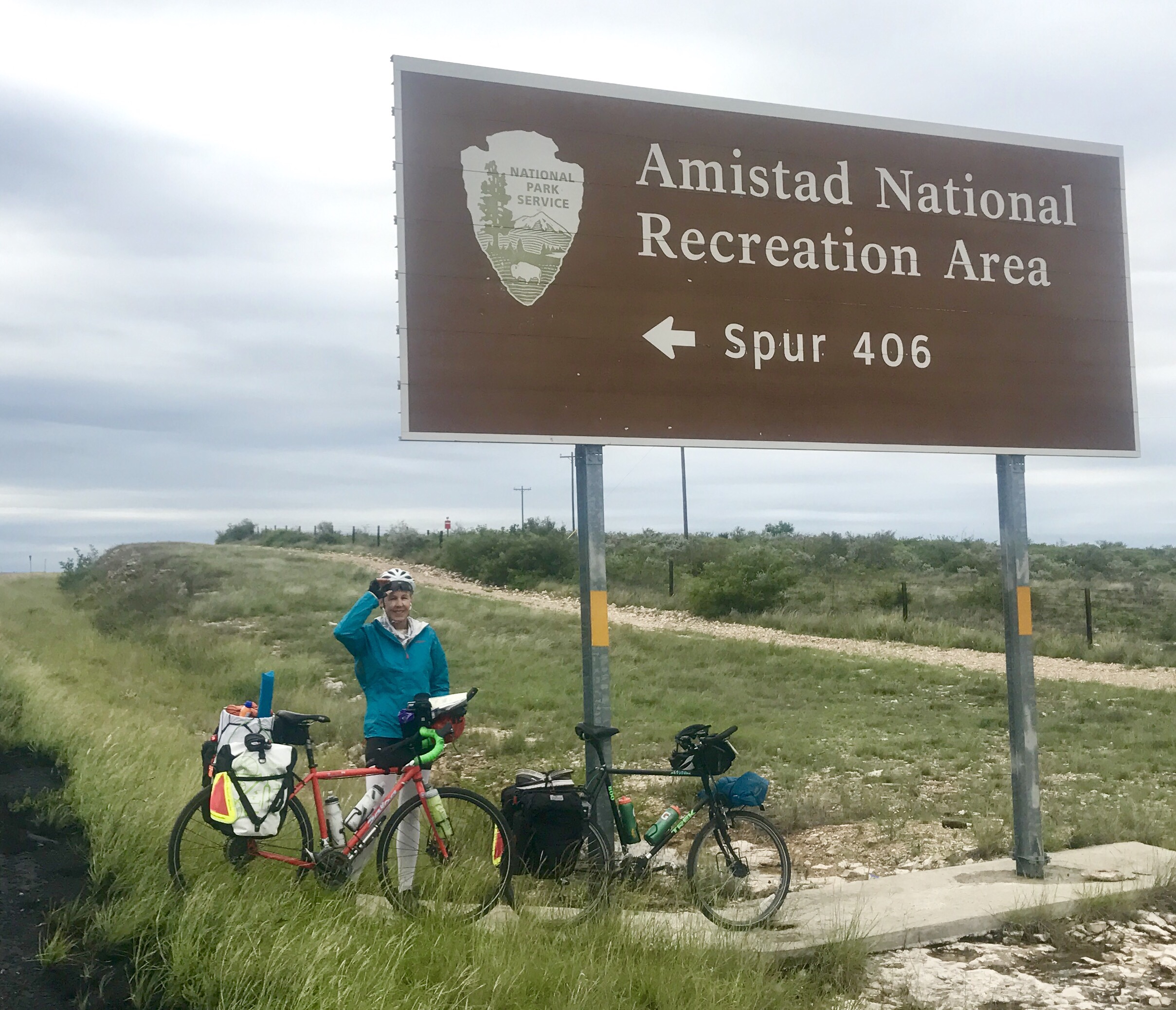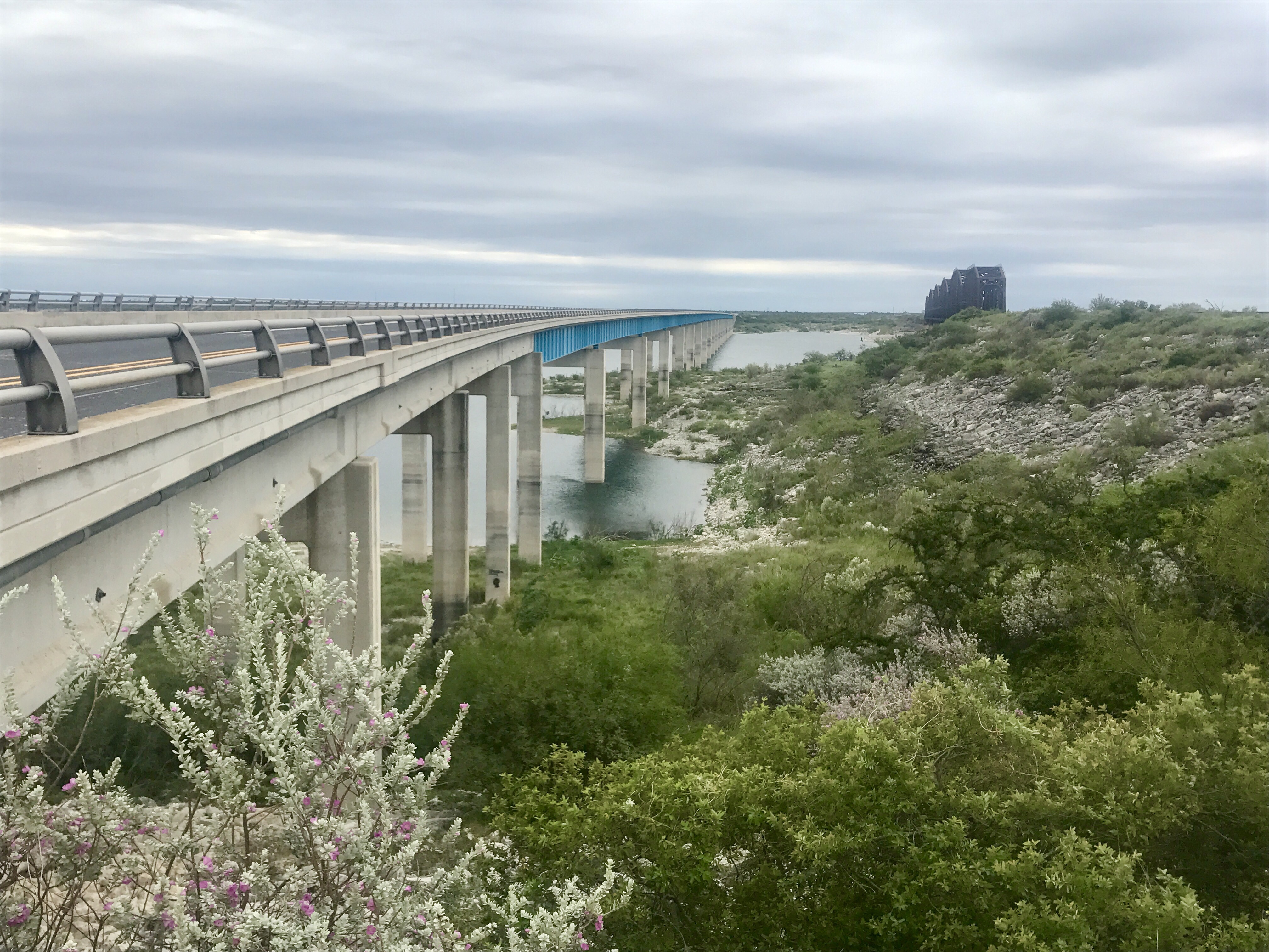 While stopped on one of the bridges across the reservoir to take pictures, I put a phone call in to Dex Tooke, a member of our 2017 Race Across America (RAAM) crew and an ultra cycling icon with both the book he authored, “Unfinished Business,” and the RAAM qualifying race he runs, “No Country for Old Men”. It turns out that Dex lives in Del Rio, just a couple of blocks off our route and only 2 miles up the road from the reservoir, so we stopped in to see him and meet his puppy, George.