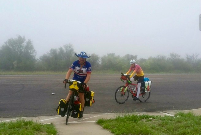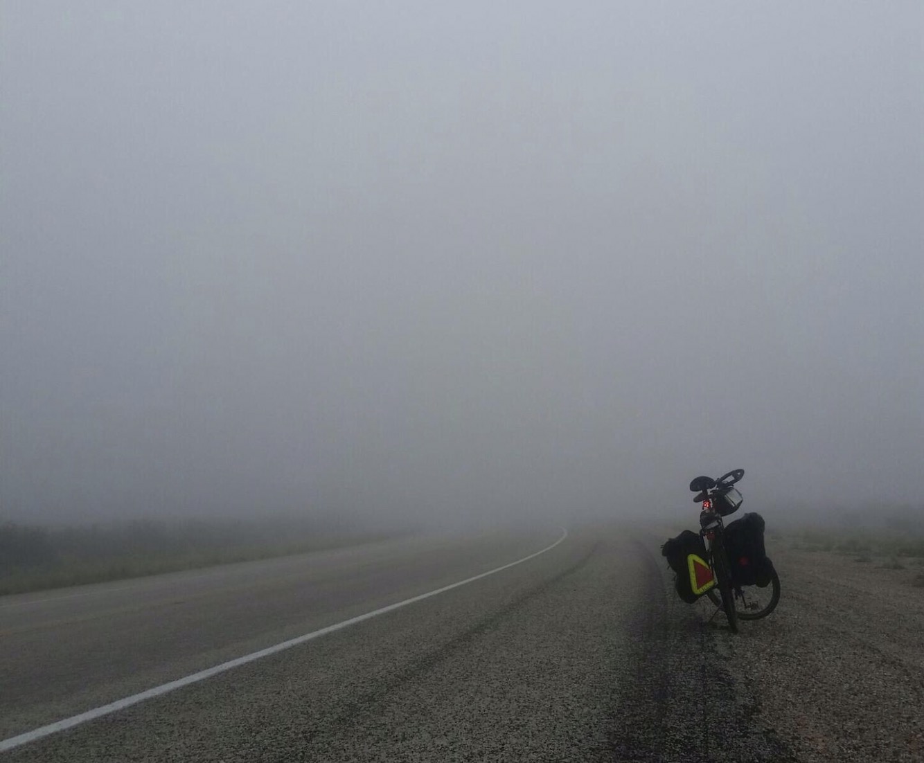 Ten miles into our ride, we ran into fog that not only erased our visibility, but was so heavy it felt like a mist.