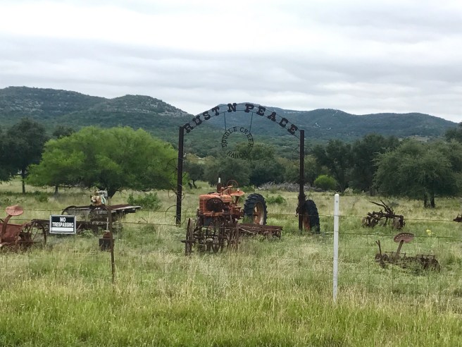 Last night, we stayed at the Three Sisters RV Park and actually thought the place was owned by 3 sisters until today when we stopped for a snack at a big high end biker (motorcycle type) hangout. The place was stocked with all kinds of “Twisted Sisters” merchandise with 3 hot babes on it, each babe labeled with her own Ranch Road. Turns out that one of the roads we have been following is part of one of the most popular Texas Hill Country motorcycle loops, Twisted Sisters, which is made up of Ranch Roads 335, 336 and 337. Having seen large groups of motorcyclists on the route, this totally made sense.