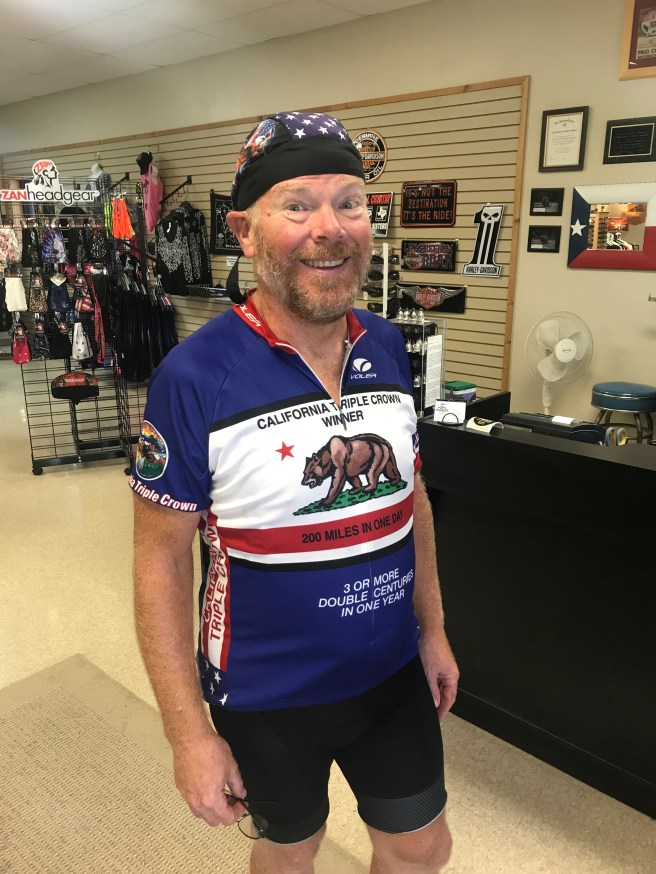About 10 miles into that last section of road, I clipped Tom’s rear wheel, as I followed him, apparently a little too closely, and me and my bike went on a collision course that for a split second was pretty scarey. The last thing to hit the ground was my helmet, and I thank the good Lord for that. I was completely decked out on the pavement with my bike laying on me while I assessed the damage: nothing broken, no concussion (I was still thinking clearly–I think), no bleeding, but a hole in the right knee of my sun legs, very minor raspberries on that knee, my right hip bone and my right shoulder, and a little scrape on my right shift lever. Am I lucky or what? (Don’t answer that. We may not agree on the correct response.) Tom lifted my bike off of me, and I layed on the pavement for another minute or so. Thank you Tom!