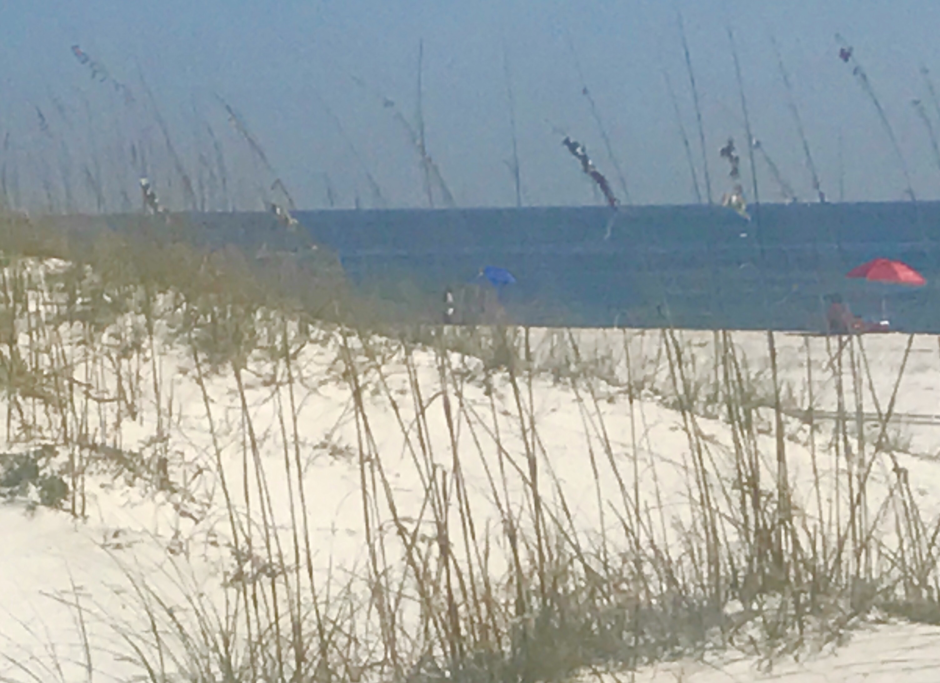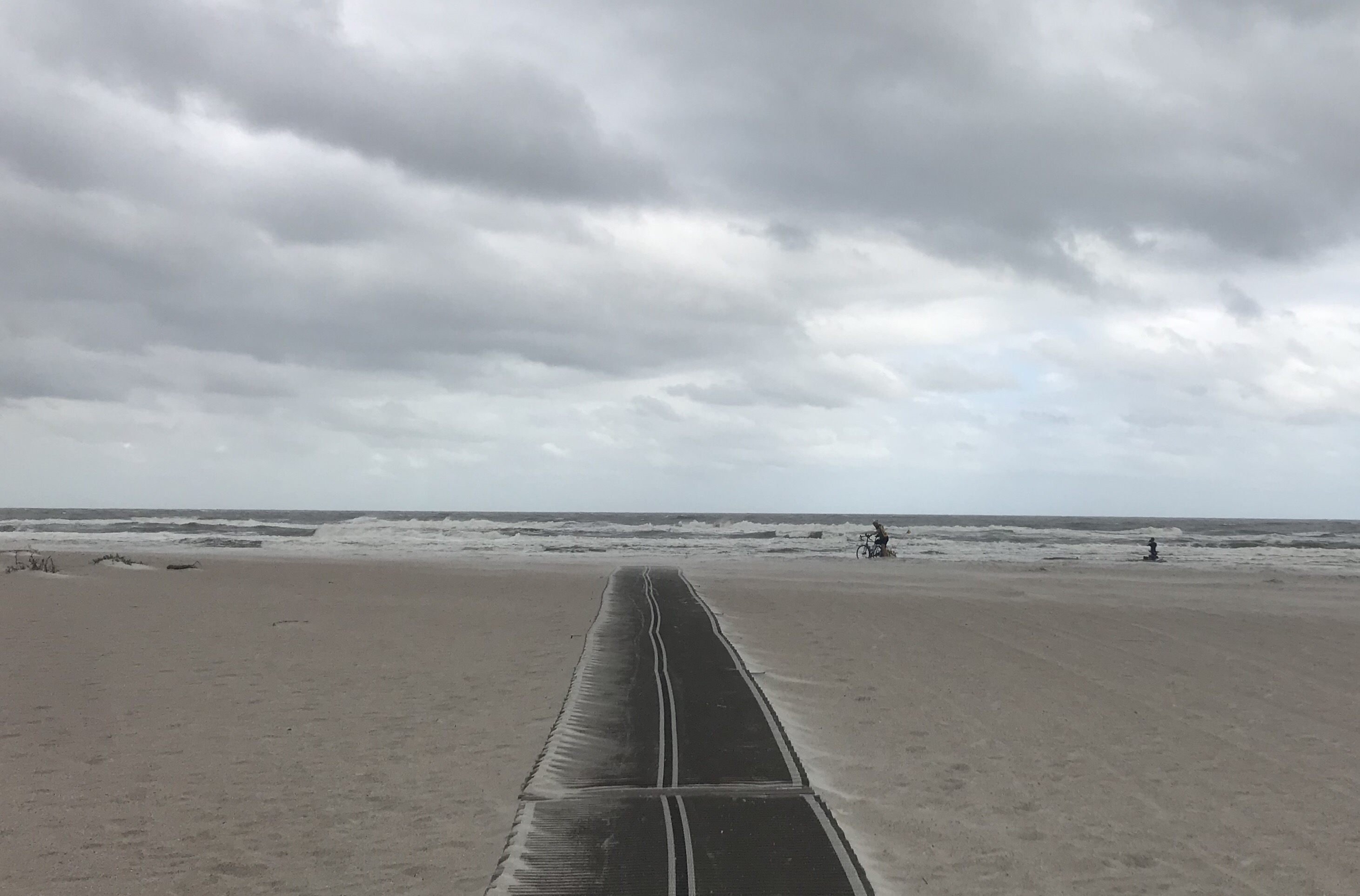 We rode a rubber boardwalk through part of the sand, but after that, we had to use all the strength we had to push our heavy bikes through deep sand and then to the water’s edge. We had 3 people taking photos of 9 stray cat cyclists, with wind and the sound of ocean water thrown into the mix. I’m not saying it was complete mayhem, but it was impossible to get everyone’s attention in any one direction at any one time for a photo with all of us looking at one camera.