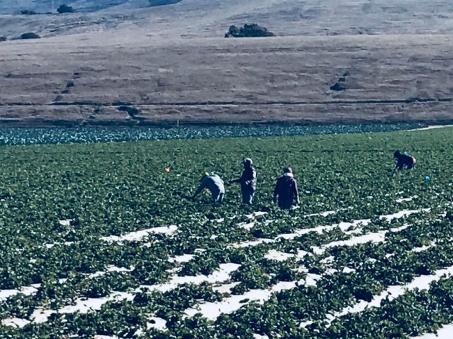 Today’s route was mostly inland, so the predominant scenery was miles and miles and miles of strawberry fields and other fertile farmland. This is the second place I have seen farm workers actually out in the fields working on the individual plants, and that field had a gazillion plants for them to use their personal touch on.