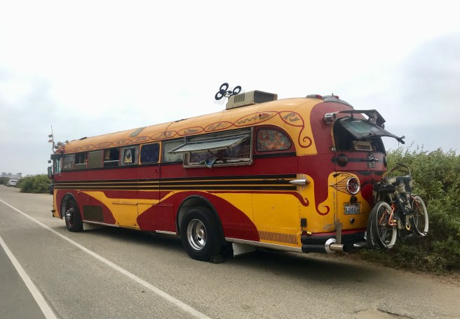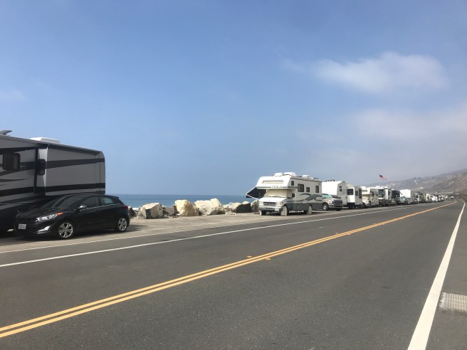 Riding through Ventura County, I passed through ‘The Rincon Parkway–what seems like a mile-long section of road that is lined off along the beach for parallel parking of RVs. They set up and camp for days at a time–right next to the ocean. Okay, biking is great, but I want one of those RVs for chilaxing, which is what all those RVers were doing. I think I need some of that balance in my life. Watching the ocean; reading, napping and eating out by the ocean; swimming and boogie boarding in the ocean; and walking along the beach are all bike free activities that were calling out to me.