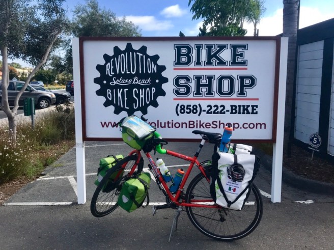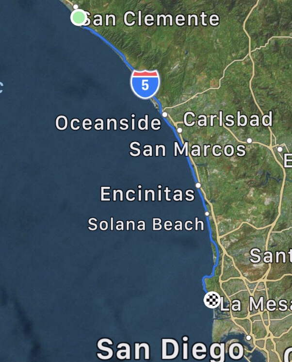 Last day of the ride, folks. No need for my tent, sleeping bag, stove, food, clothes, hygiene kit, etc. Today was Supposed to be just a little 28 mile ride to the Mexican Border. I rode with just my handlebar bag. A couple of riders had told me that they easily got to the border by following the bike path, with no navigation for most of the day. Yeah, right. That was bad information. There were turns in the bike paths, that, if you don’t take them, send you into rabbit hole cul-de-sacs, marinas, etc. After 34 days on a bike, those little missed turns were beyond irritating.