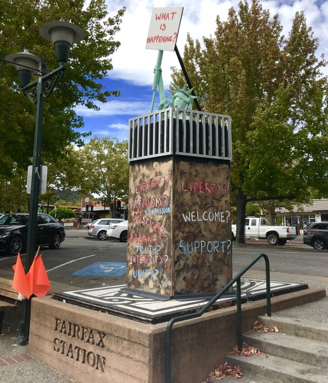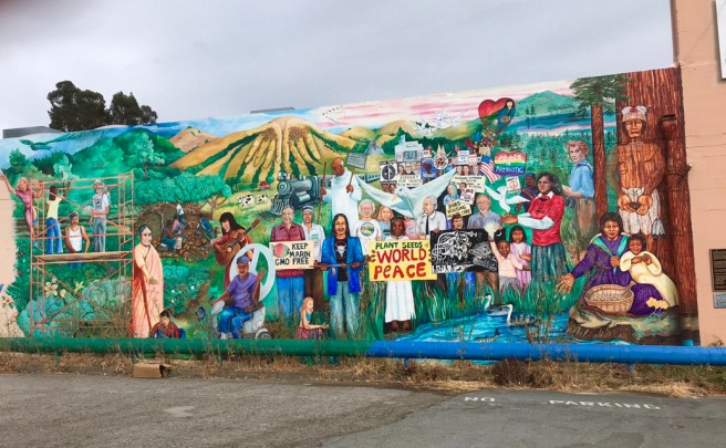After descending from the climb into and past Woodacre, we were on a nice bike path that sped us through a series of cute little Marin County towns, starting with Fairfax, my favorite. It had the following mural that was the subject of the book, “Seeds of Peace: A Community Mural–Part Offering, Part Hope”. The people and symbols depicted in the mural are real people and symbols from the community.