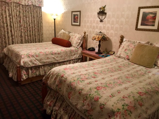 My digs for the night were a huge room in a quaint little motel, with antique furniture, Tiffany lamps, and brocade wallpaper. I hated bringing my bike inside and covering one of the beds with a bunch of gear, but it had to be done.