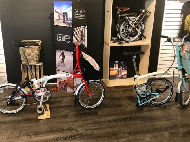 These are Bromptons–the original British-made folding bike. The US made Bicycle Friday is actually a legitimate touring bike, so the shop owner told me. See? I’m learning new things on this trip.