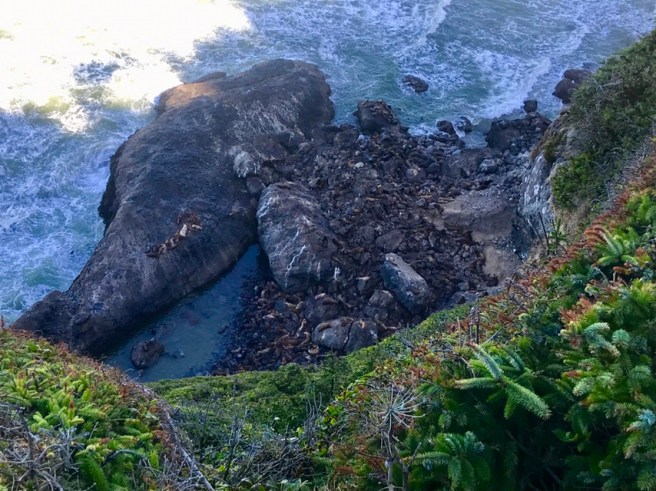 And here is where things started to change. After a couple of ridiculous climbs, outside of Leggett, I descended out of the Redwoods and passed the terrain below, with trees blown permanently eastward. And then the road turned, and I was on Highway 1 following the coast. And I mean, right on the edge of a cliff following the coastline.
