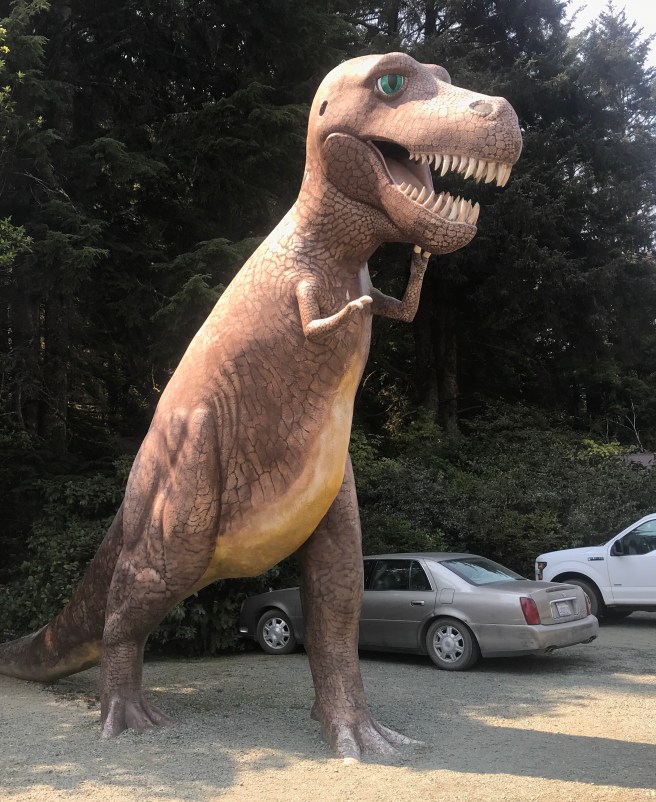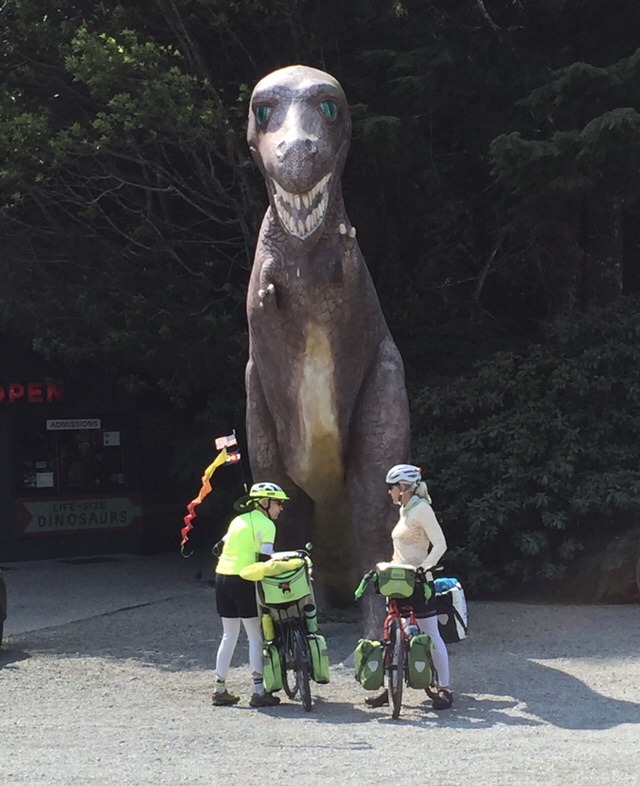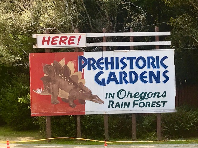 I did fall for the Prehistoric Garden–the part you don’t have to pay admission for. A gal from California, who I met a few miles back, pulled in just as I was getting set for a selfie, and up rides Gerth. He snapped the excellent photographic specimen below of me and Chris.