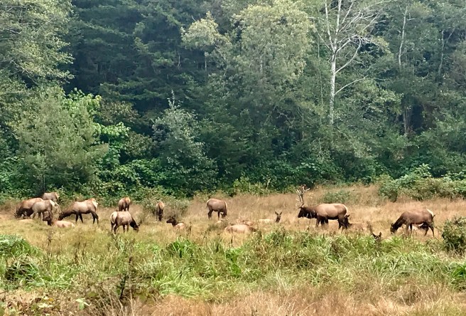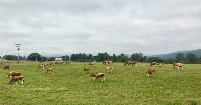The bike path kept turning into gravel–steep gravel, so I found a spot to exit, and got on Highway 101, but in this part of the state, it is a limited access freeway, and at that time of day, the traffic was crazy. So I asked Google Maps for advice on how to get to my cheap motel for the night, and it routed me through about 10 miles of countryside, with happy herds of cattle and sheep, and one bison.