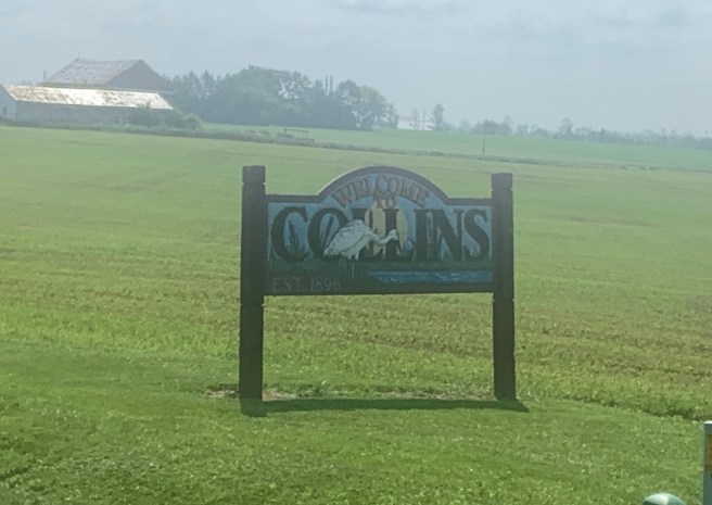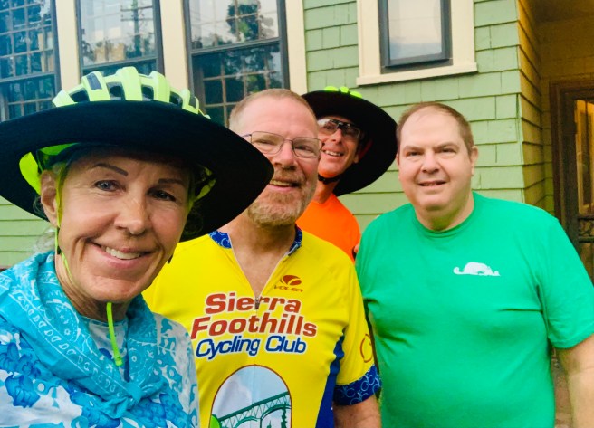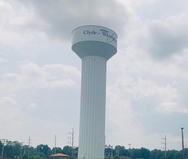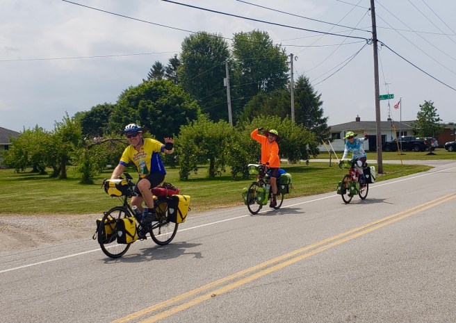 When we left Fremont, we got on a new rail trail–the North Coast Inland Trail–which took us through Clyde. Sue drove ahead and waited for us in Clyde, so she could snap some photos of us riding through, then she moved on to the home of our Warm Showers hosts, Lance and Pam, while we cycled the last 24 miles to meet her there.