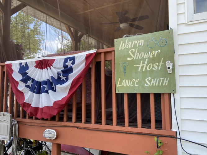 Lance had a really cool setup, with a beautiful home that he updated himself; a great outdoor space, with a screened porch, complete with its own refrigerator; and sleeping places scattered around in the living room, on the porch, under another patio cover, etc. Lance is one of those guys who has skills to do anything he sets his mind to. He has done a good amount of bicycle touring, so had some stories to tell. We sat out on the porch and talked for quite a while, before heading inside for dinner. Pam had cooked up an amazing lasagne, and Lance had prepared a salad, garlic toast and some ice cream for dessert. We were in heaven. Sue had to head home, so she could be there for church obligations, but she left us with some delicious cinnamon rolls that she’d bought at the street fair. We gave her a birthday card for her upcoming birthday (Monday, the 9th), then broke into the cinnamon rolls about 2 seconds after she drove away.
