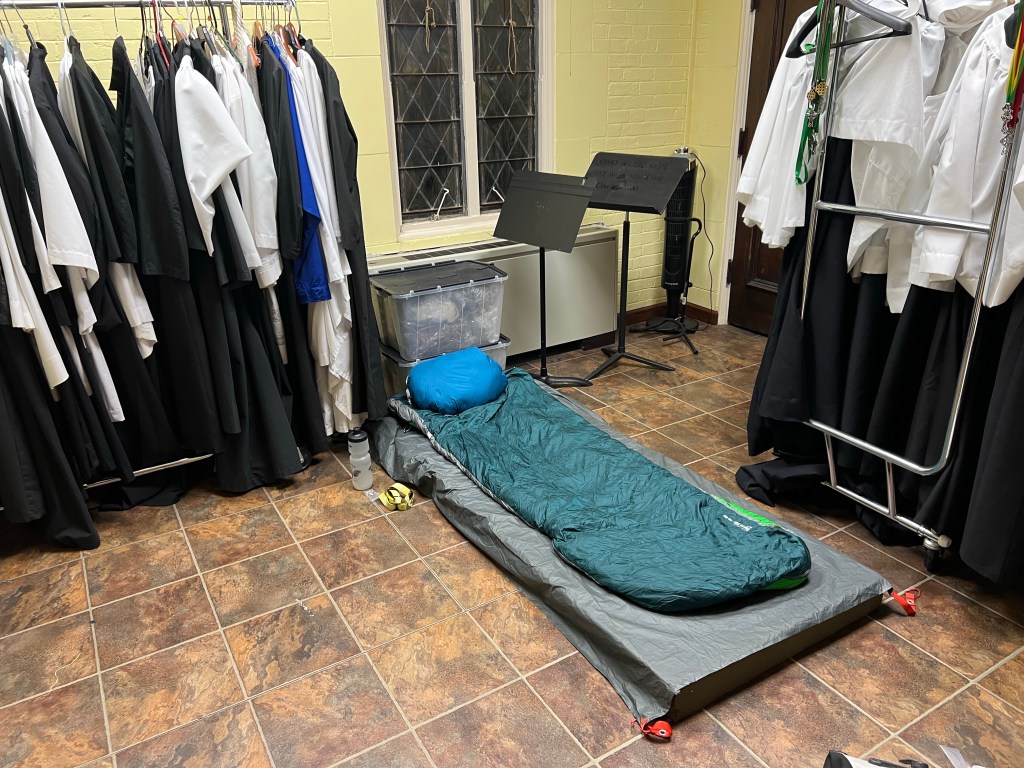 I’d like to say that I slept in today and lounged around eating bonbons, but you know that would never happen. I stayed up late getting caught up on Ted Lasso (loved the bike connection with Roy Kent), but was only able to sleep till 8:00, when someone woke me to see if I wanted to go to breakfast with the team. Grrrr! I was ready to go in about 2 minutes. Had a great bagel sandwich for breakfast, then headed back to the church to get my chores done.